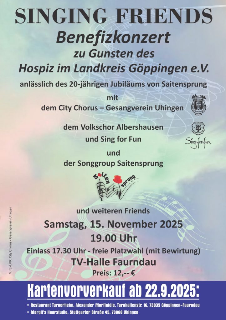 15.11.2025: 20 Jahre Saitensprung – Singing Friends – Ein Benefizkonzert für das Hospiz in Faurndau in der TV Halle Faurndau